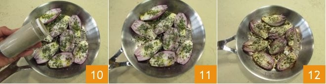 e a pimenta 10. Neste ponto 11, asse em forno estático pré-aquecido a 190° por cerca de 30-35 minutos, na prateleira do meio. Retire do forno e sirva suas cebolas de Tropea assadas 12 com os pratos principais de sua preferência!