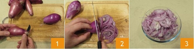 Para preparar as cebolas de Tropea caramelizadas, comece descascando-as, removendo tanto a pele quanto as duas extremidades 1. Em seguida, passe para o corte, você pode fatiá-las não muito finamente com uma faca lisa 2 e coletar as rodelas obtidas em um recipiente 3.