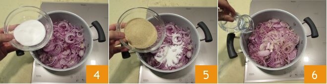 Coloque as cebolas cortadas em uma panela grande junto com o açúcar granulado 4 e o açúcar mascavo 5, misture bem para que os ingredientes se combinem bem entre si e adicione a água 6.