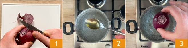 Para preparar as cebolas gratinadas, descasque as cebolas, retire apenas a primeira camada externa e as eventuais raízes 1, enxágue-as. Leve à fervura água com uma colher de sopa de vinagre de vinho branco 2 e mergulhe as cebolas inteiras 3, cozinhe por 10 minutos.