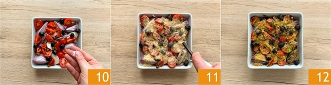 as alcaparras, as azeitonas pretas e ajuste o sal 10 e a pimenta. Polvilhe abundantemente a superfície com a mistura de farinha de rosca e parmesão, regue com óleo 11. Asse em forno estático pré-aquecido a 180°C por 20 minutos e depois passe para o grill por mais 5 minutos. Antes de servir, polvilhe a superfície com salsinha fresca picada 12.