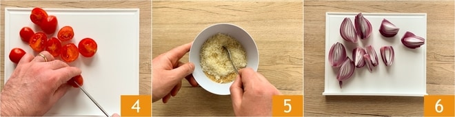 Enquanto isso, lave e seque os tomatinhos, corte-os em gomos 4 e reserve. Coloque a farinha de rosca em uma tigela e adicione o parmesão ralado 5, misture tudo. Escorra as cebolas e deixe esfriar. Corte-as em gomos 6.