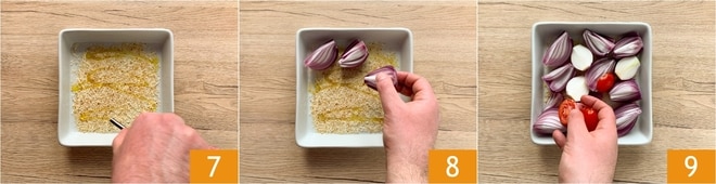 Forre o fundo de uma assadeira com a mistura de farinha de rosca e parmesão, regue com um fio de óleo 7. Disponha os gomos de cebola 8, adicione os tomatinhos 9,