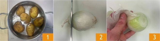 Para preparar as cebolas recheadas à moda da Ligúria, primeiro cozinhe as batatas em uma panela com água fria por cerca de 30-40 minutos após a fervura 1. Enquanto isso, corte as extremidades das cebolas 2 e remova a casca 3.