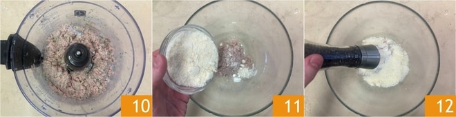 Bata 10 e transfira a mistura para uma tigela, depois adicione o Parmigiano Reggiano DOP ralado 11, sal e pimenta 12.