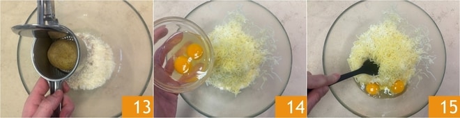 Adicione também as batatas amassadas 13 e os ovos 14, então misture tudo com uma colher 15.
