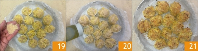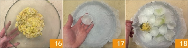 Você deve obter uma mistura homogênea 16. Nesse ponto, forre uma assadeira com papel manteiga e coloque as camadas de cebola dentro 17, depois recheie-as com a mistura usando 2 colheres 18.