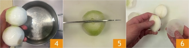 Escalde as cebolas inteiras por 5 minutos em água fervente salgada, apenas o tempo suficiente para amolecê-las 4. Escorra as cebolas e corte-as ao meio 5, depois separe as camadas delicadamente e reserve as maiores 6.
