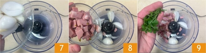 As camadas menores das cebolas e as quebradas servirão para o recheio, então coloque-as em um processador 7 junto com a mortadela 8 e a manjerona 9.