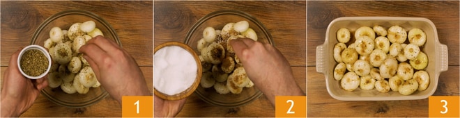 Para preparar as cebolinhas assadas, em uma tigela grande, coloque as cebolas borettanas previamente descascadas. Adicione o vinagre de maçã, o açúcar mascavo e o orégano 1. Junte uma pitada de sal 2 e um bom fio de azeite. Misture tudo bem e transfira para uma assadeira 3. Asse em forno estático preaquecido a 180° por 50 minutos. Retire do forno, deixe amornar e sirva suas cebolinhas assadas com o molho de cozimento.