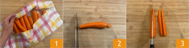 Para preparar as cenouras assadas, primeiro lave-as bem, depois seque-as com um pano limpo 1. Apare as extremidades 2 e corte-as ao meio no sentido do comprimento 3.