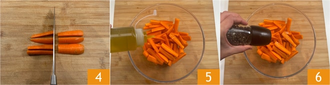 Encorte o comprimento cortando ao meio 4 e coloque-as em uma tigela. Tempere com óleo 5, sal e pimenta 6.