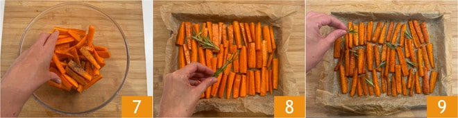Massageie os palitos para temperá-los de maneira uniforme. Disponha as cenouras em uma assadeira forrada com papel manteiga, cuidando para não sobrepor, adicione ramos de alecrim 8 e asse em forno estático pré-aquecido a 220° por 40 minutos. Uma vez assadas, perfume com mais alecrim fresco. Suas cenouras assadas estão prontas para serem servidas 9!