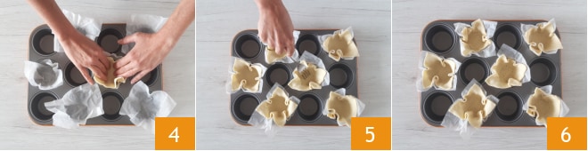 Coloque cada quadrado de massa em uma forminha de muffin, previamente forrada com papel manteiga. 4 Fure a massa com um garfo 5 e leve ao forno 6.