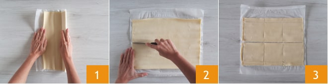 Para preparar as cestinhas de creme e morangos, comece desenrolando a massa folhada 1, corte com uma faca lisa 2, obtendo assim 6 quadrados de 6x6cm do mesmo tamanho 3 (as partes restantes podem ser usadas para fazer pequenos Grissini rápidos de massa folhada com tomate).