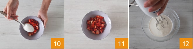 Tempere com o açúcar granulado 10, misture e mantenha na geladeira até o momento de usar 11. Coloque o creme bem frio em uma tigela e comece a bater com uma batedeira elétrica 12,