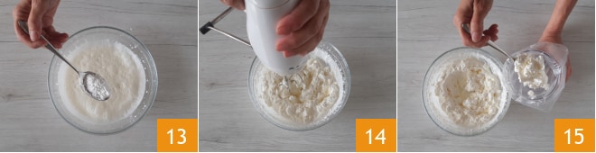 depois de 1 minuto, adicione o açúcar de confeiteiro 13 e bata até ficar em ponto de neve bem firme 14. Coloque o creme batido em um saco de confeitar, ou, se preferir, coloque o creme às colheradas nas cestinhas 15.