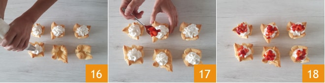 Recheie as cestinhas com o creme batido 16, usando um bico estrela e decore com os morangos 17. Aqui estão suas cestinhas de creme e morangos prontas, saboreie imediatamente 18!