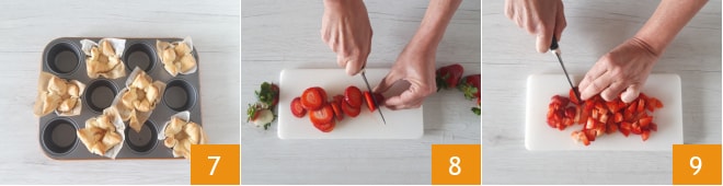 As cestinhas assam em forno ventilado pré-aquecido a 180°C, por cerca de 18-20 minutos (ou até que a massa folhada fique dourada) 7. Retire as cestinhas do forno e deixe esfriar completamente. Enquanto isso, limpe os morangos, fatie-os 8 e corte em pedaços 9.