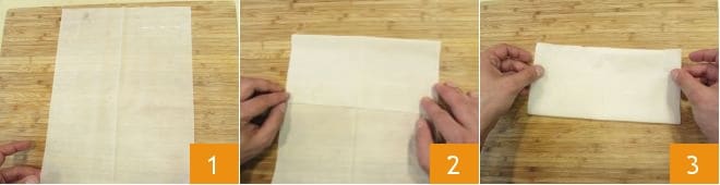 Para preparar as cestinhas de massa filo com sorvete, comece colocando à sua frente uma folha de massa filo por vez 1: dobre um terço do retângulo para dentro 2, depois sobreponha o outro terço de modo a formar um retângulo menor 3.