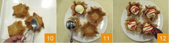 Quando a cestinha estiver dourada de forma uniforme, retire-a do óleo e coloque-a para escorrer de cabeça para baixo em uma bandeja forrada com papel toalha 10. Proceda da mesma maneira para fritar todas as cestinhas. Uma vez frias, coloque as cestinhas em um prato de servir, preencha cada uma com uma bola de sorvete de creme 11 e decore com a cobertura de morango 12: suas cestinhas de massa filo com sorvete estão prontas para serem degustadas!
