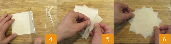 Dobre este retângulo ao meio, obtendo assim um quadrado. Corte as bordas do quadrado com uma faca de lâmina lisa 4, separe as 6 folhas de que é composto 5 e gire-as ligeiramente de modo que as pontas fiquem desencontradas, formando uma espécie de estrela de várias pontas 6. Repita o mesmo procedimento com as outras 3 folhas de massa filo.