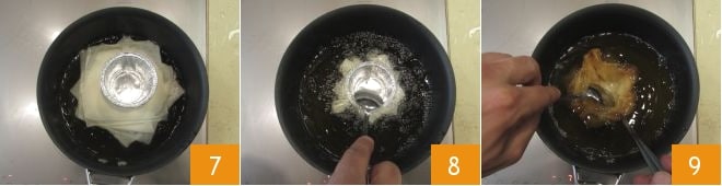 Despeje o óleo de sementes em uma panelinha e leve à temperatura de 170°. Coloque uma estrela de cada vez no óleo quente, posicione no centro um molde de alumínio com cerca de 5 cm de diâmetro na base 7 e pressione-o com uma colher para que a massa filo fique imersa no óleo enquanto adquire a forma do molde 8. Após alguns minutos, vire a cestinha ajudando-se com outra colher e frite por mais 2 minutos para dourar também o interior 9.