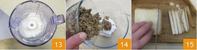 Bata para obter um molho homogêneo 13, depois transfira para uma tigela e adicione o ragu 14, reservando 4 colheres para decorar as cestinhas depois de assadas. Enquanto isso, pegue o pão de forma, corte as bordas de cada fatia 15,