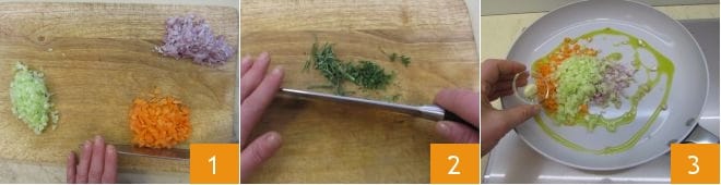 Para preparar as cestinhas de pão de forma, comece pelo ragu: descasque a cenoura, o aipo e a cebola e depois pique-os finamente 1. Pique também as folhas de tomilho e as agulhas de alecrim 2. Refogue o tempero de legumes na panela com o azeite de oliva e um dente de alho 3 por pelo menos 10 minutos ou até que os legumes fiquem macios.