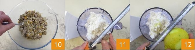 Se necessário, adicione mais caldo. Quando estiver cozido, desligue o fogo, transfira o ragu para uma tigela e deixe esfriar 10. Enquanto isso, coloque a ricota no liquidificador e aromatize com a noz-moscada 11 e as raspas de limão 12.