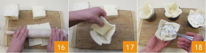 depois, com a ajuda de um rolo, achate as fatias de pão de forma para deixá-las mais finas 16, pegue 4 cocottes de 9 cm de diâmetro com borda alta de 5 cm e insira dentro de cada cocotte 4 fatias de pão de forma levemente sobrepostas, criando uma cavidade interna 17. Recheie cada cestinha com a mistura de ricota e ragu 18 pressionando levemente com as costas de uma colher.
