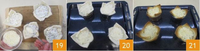 Polvilhe a superfície com o parmesão ralado (19-20) e asse em forno estático pré-aquecido a 200°C por 10 minutos (ou em forno ventilado a 180°C por 5 minutos). Quando estiver assado, retire as cestinhas do forno 21 e deixe esfriar um pouco.