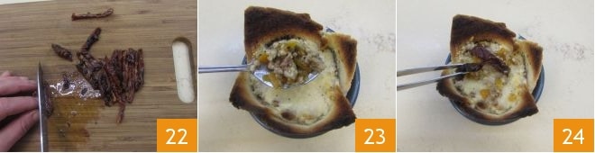 Enquanto isso, escorra os tomates secos em conserva de óleo, corte-os em tiras 22. Distribua sobre cada cestinha uma colher de ragu 23 e, para finalizar, coloque sobre os tomates secos em conserva de óleo 24 e algumas folhas de tomilho fresco. As cestinhas de pão de forma recheadas estão prontas para serem saboreadas.