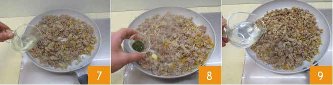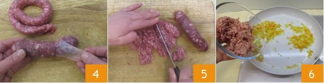 Enquanto isso, remova a pele da linguiça 4, depois pique-a 5 ou desfie-a com as mãos. Adicione a carne de porco moída e a linguiça ao refogado 6, misture com uma colher e refogue por alguns instantes para dar sabor.