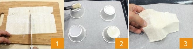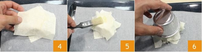 Para preparar os cestinhos de phyllo com salmão e creme de abobrinha, corte 3 folhas de massa phyllo de 24X34 cm em 4 partes para obter 4 retângulos 1. Em uma assadeira forrada com papel manteiga, coloque 4 formas de alumínio invertidas, unte o fundo e as laterais com manteiga derretida 2 e coloque por cima um quadrado de massa phyllo 3 umedecido com água