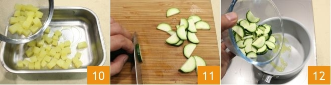 coloque o restante em uma assadeira com um fio de azeite 10 e asse por 10 minutos ou até que fiquem douradas (como alternativa, você pode fritá-las em uma frigideira com um fio de azeite). Lave e corte as abobrinhas em fatias finas 11, coloque-as em uma panela com um fio de azeite 12
