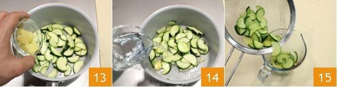 adicione também a colher de batatas reservada 13 e deixe pegar sabor por alguns segundos, depois cubra com água 14, leve à fervura e cozinhe por 5 minutos. Escorra os vegetais em um copo alto 15