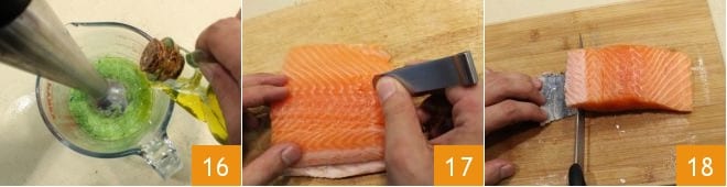 misture-os com o mixer de imersão, adicionando azeite em fio 16 até obter um creme para reservar. Cuide do filé de salmão: remova as espinhas com uma pinça apropriada 17, depois retire a pele separando a carne com uma faca fina 18,