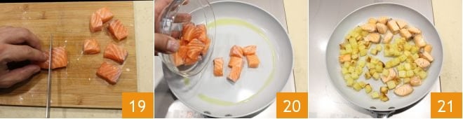 corte o salmão em cubos 19 e aqueça um fio de azeite em uma frigideira, depois refogue os cubos de salmão por alguns minutos 20, tempere com sal, pimenta e folhinhas de tomilho, depois desligue o fogo e adicione as batatas assadas 21 (ou cozidas na frigideira).