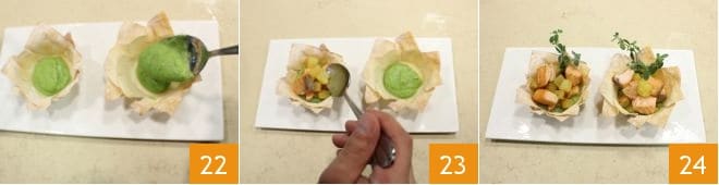 Monte os cestinhos: coloque os cestinhos em um prato de servir e recheie com uma colher de creme de abobrinha 22 (se preferir, pode usar um saco de confeitar) e adicione também os cubos de salmão e batatas 23. Para decorar, enfeite os cestinhos de phyllo com salmão e creme de abobrinha com ramos de tomilho 24.