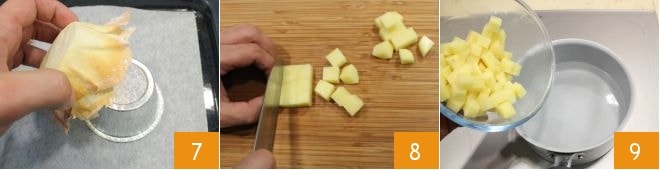 Asse os cestinhos em forno estático pré-aquecido a 190° por 4 minutos (se usar forno ventilado, a 170° por cerca de dois minutos). Retire os cestinhos do forno e deixe esfriar, depois retire as formas de alumínio 7. Descasque as batatas e corte-as em cubos 8, escalde-as em água por alguns minutos 9, depois escorra-as, reservando uma colher