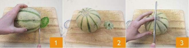 Para preparar as cestas de presunto e melão, a primeira coisa a fazer é esculpir os melões para obter pequenos recipientes que depois iremos preencher. Comece cortando uma rodela no topo do melão 1. Agora vire-o, apoiando-o na parte cortada 2 para que fique mais estável. Proceda agora com o corte que logo se tornará a alça da cesta. Faça um corte profundo na parte superior da fruta, a cerca de 1,5 cm do talo, que vá até a metade do melão 3.