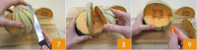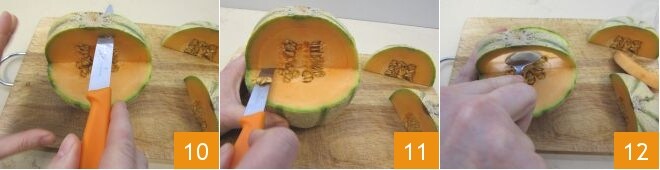 Siga a forma do melão 10 e conclua fazendo um corte horizontal 11; remova a meia-lua de polpa obtida. Agora você pode escavar com a ajuda de uma colher para eliminar as sementes 12
