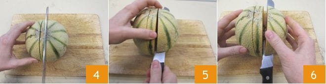 Faça em seguida um corte igual e paralelo, distanciando-o do outro cerca de 3 cm 4. Afunde também neste caso a faca até a metade do melão, como se quisesse cortar uma fatia. Corte agora 1 dos dois gomos laterais obtidos e remova-o (5-6)