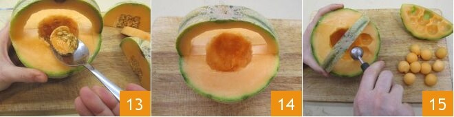 e os filamentos do coração do melão (13-14)  Recolha a polpa da fruta em pequenas esferas com a ajuda de um boleador 15