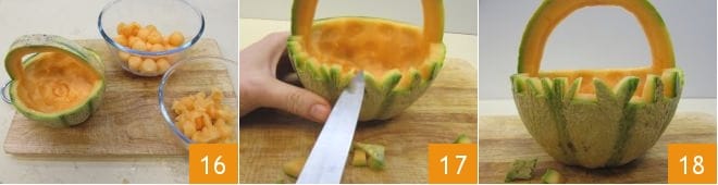 recolhendo-as em um recipiente à medida que estão prontas, e até que o melão esteja completamente vazio 16. Com a ajuda de uma faca de lâmina afiada, incise agora as bordas da cesta obtida, até dar-lhe um perfil ondulado (17-18).
