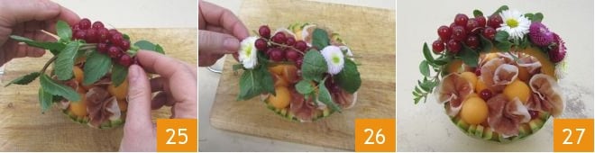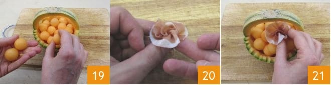 É hora de encher a cesta: coloque dentro as esferas de polpa de melão 19 e as rosinhas obtidas enrolando as fatias de presunto em formato de botão (20 e 21),