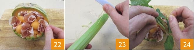 dispondo-as a uma distância regular para dar-lhes a aparência composta de um bouquet 22. Agora retire alguns fios de aipo, puxando delicadamente com a ajuda de uma faquinha alguns longos filamentos externos conforme a figura 23. Use os fios de aipo para amarrar ao cabo da cesta de melão os raminhos de hortelã fresca 24,