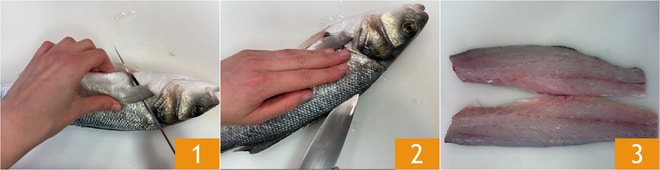 Para preparar o ceviche de robalo, primeiro cuide da limpeza do peixe. Desescame-o sob água corrente, depois faça um corte no ventre e eviscere-o, passe novamente sob a água corrente para eliminar eventuais impurezas. Faça um corte oblíquo, logo após as guelras 1, que comece pelas costas e se junte ao corte feito anteriormente no ventre. Corte a cauda e a parte dorsal do peixe seguindo a coluna vertebral 2 para obter o primeiro filé, repita o mesmo procedimento para o segundo 3.