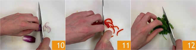 Pique finamente com a faca: a cebola 10, a pimenta 11, após retirar as sementes, e o coentro 12.